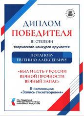 Евгений Потапов стал Победителем творческого конкурса "Был и есть у России вечной прочности вечный запас" и 29 сентября 2025 года получил свою награду из рук народного артиста РФ Дмитрия Певцова.
